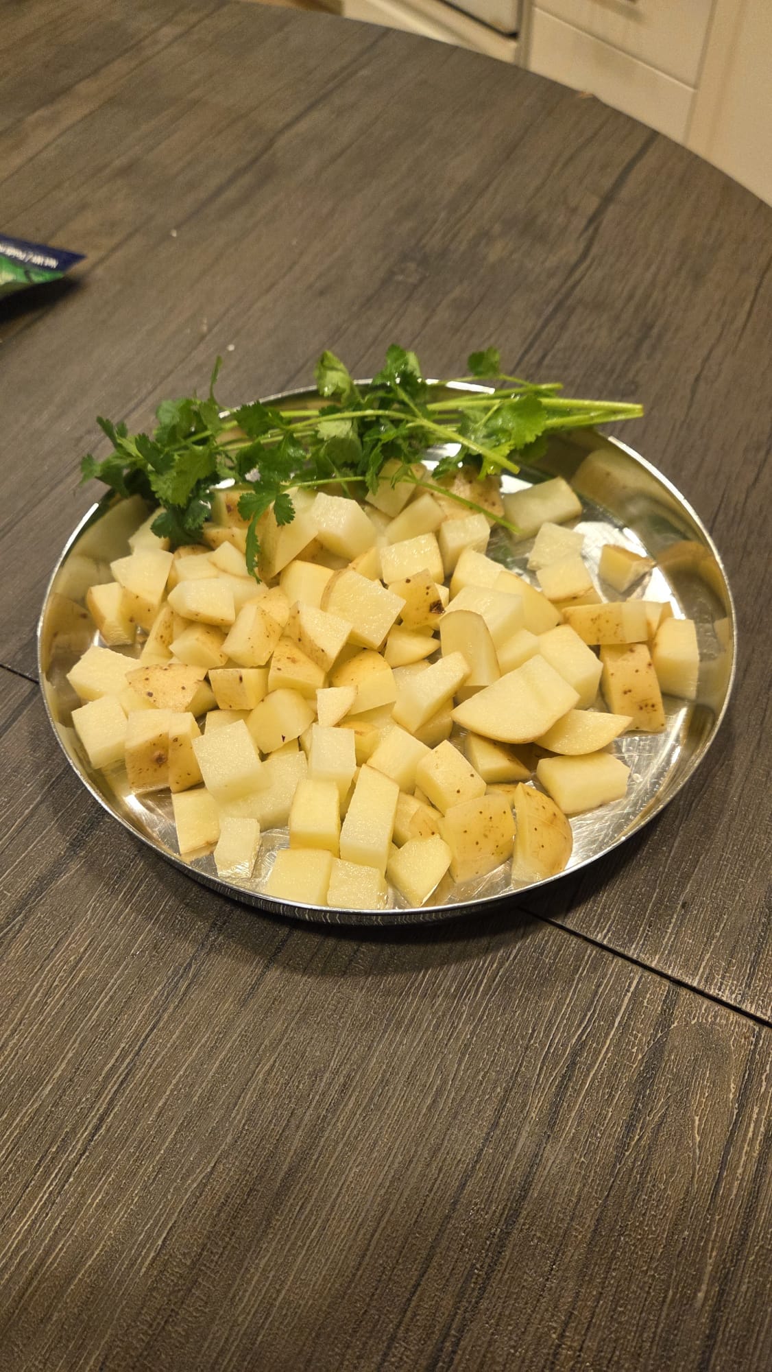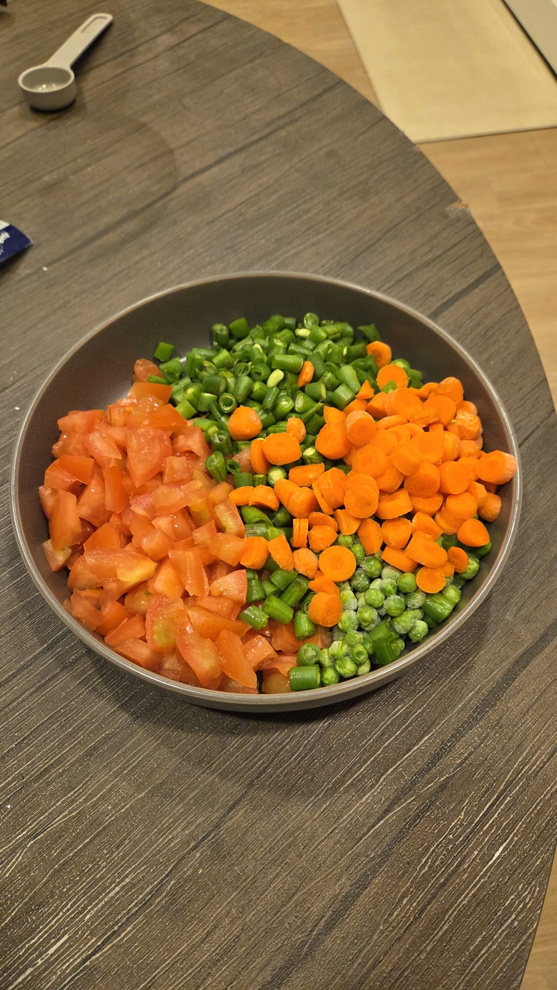 - Cut one tomato, 5 baby carrots and quarter onion in a diced fashion and 1 or 2 Tomato