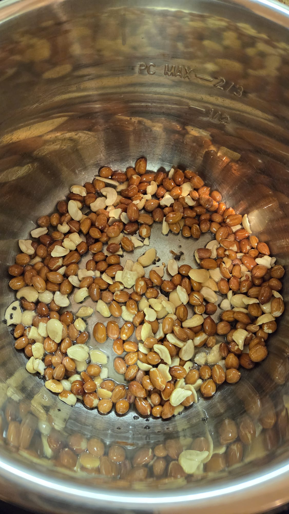 - In cooker/instant pot in saute mode, take 1TBSP of oil and heat. Add 1 tsp of mustard and some peanuts and cashew