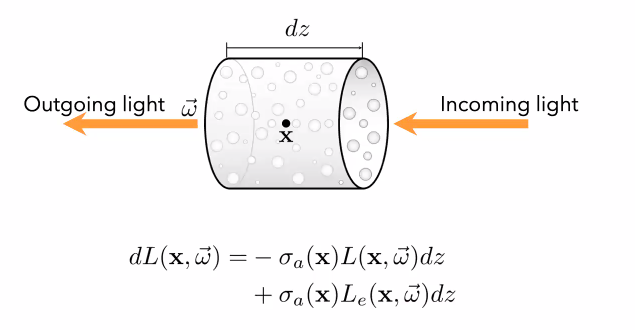 Modelling only absoroption through a non-homogenous volume, we derive the relationship between incoming radiation and outgoing radiation as follows: