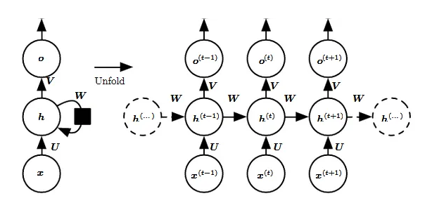 RNNs have a hidden state neuron which is connected across the time series as shown below: