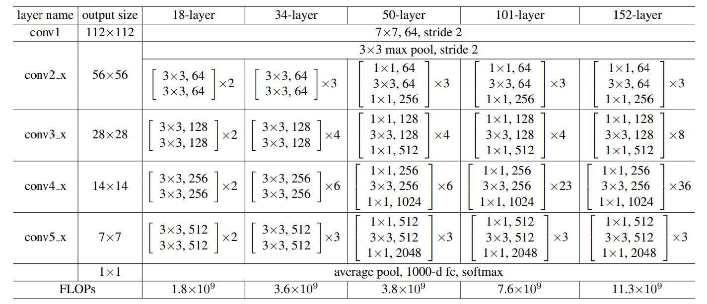 Where the final 1000x1 vector is for the 1000 ImageNet classes. Also note the number of repeating ResNet block in each layer (50-layer or ResNet50 being referred below):